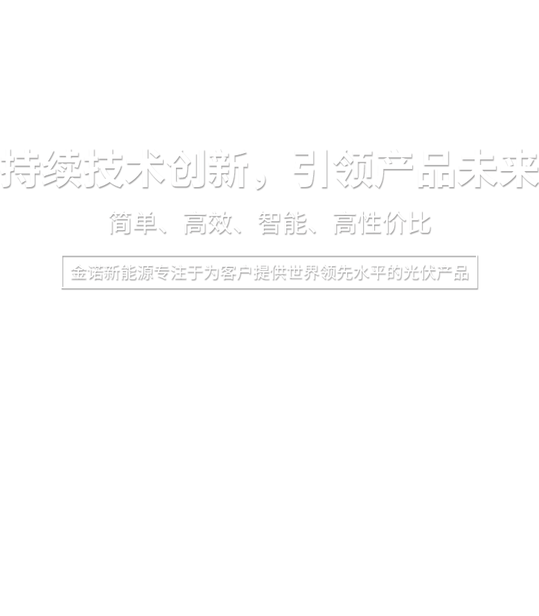 金諾新能源專注于為客戶提供世界領先水平的光伏產品,大力實施科技創新。我們秉持“品質為先,服務全球”的理念,為客戶創造更高價值,并與您分享世界綠色能源在陽光下的成長喜悅!